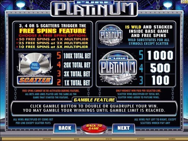 Pure Platinum is a video pokie from Microgaming that offers 40 paylines on a five reel set up. The game is loaded with great features to help players win more and the maximum payout amount is $100,000, so this is definitely a game that can be enjoyed by many as they watch their bankrolls increase.