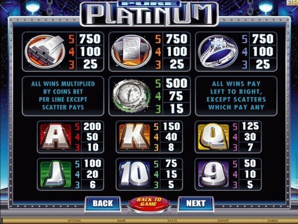 The nice aspect of playing Pure Platinum is that players will have a variety of betting options available. The game can be played as a penny pokie or players can bet as much as $0.05 per payline. This boosts the maximum bet to $20 per spin for those that wish to have the best chances at receiving the highest rewards from the game.