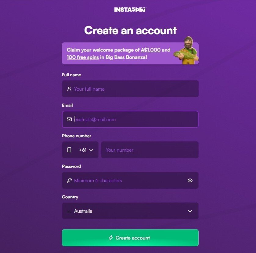 The registration process at Instaspin is super easy. As soon as you enter the casino site you will notice a green “Sign Up” button on the upper-right corner. Clicking it will open a web form requesting the following details: