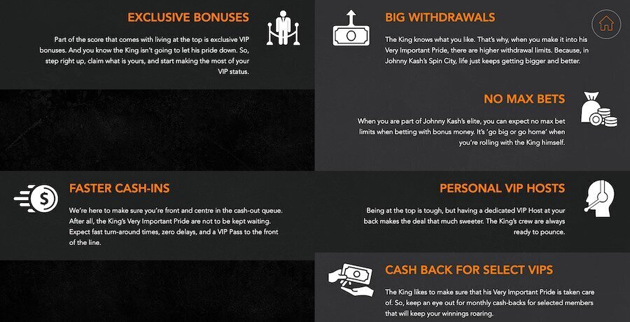 Johnny Kash has a potentially lucrative loyalty program known as Kash Kings. You earn loyalty points for every $20 you deposit at Johnny Kash and more points each time you play pokies and table games. The more points you earn, the higher up the VIP chain you climb and the benefits becoming better and better.